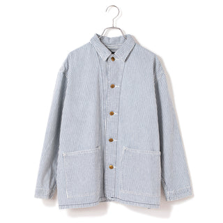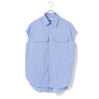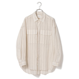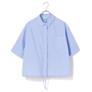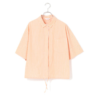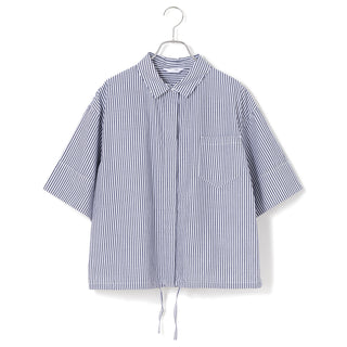 今季旬なストライプシャツ。裾のブラウジングでカジュアルにも。