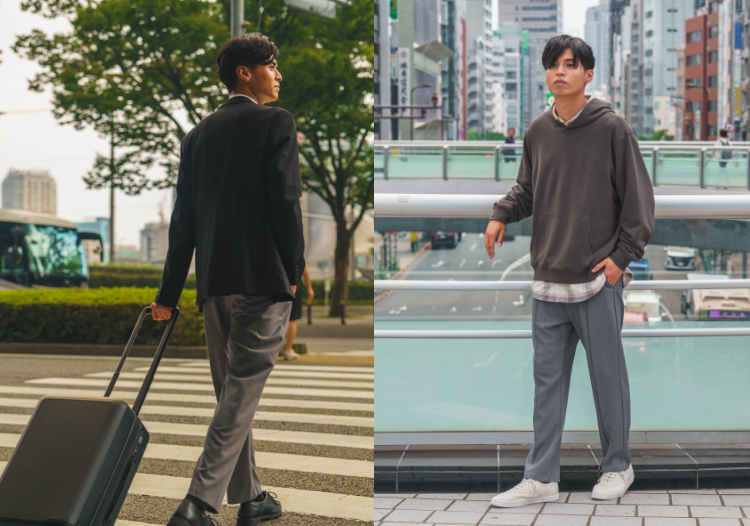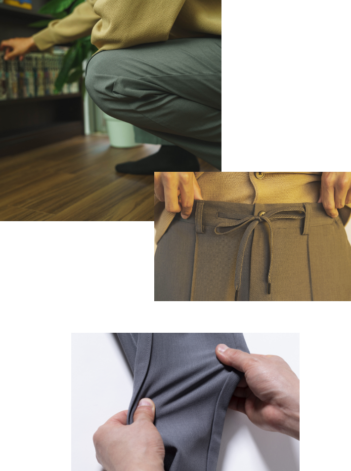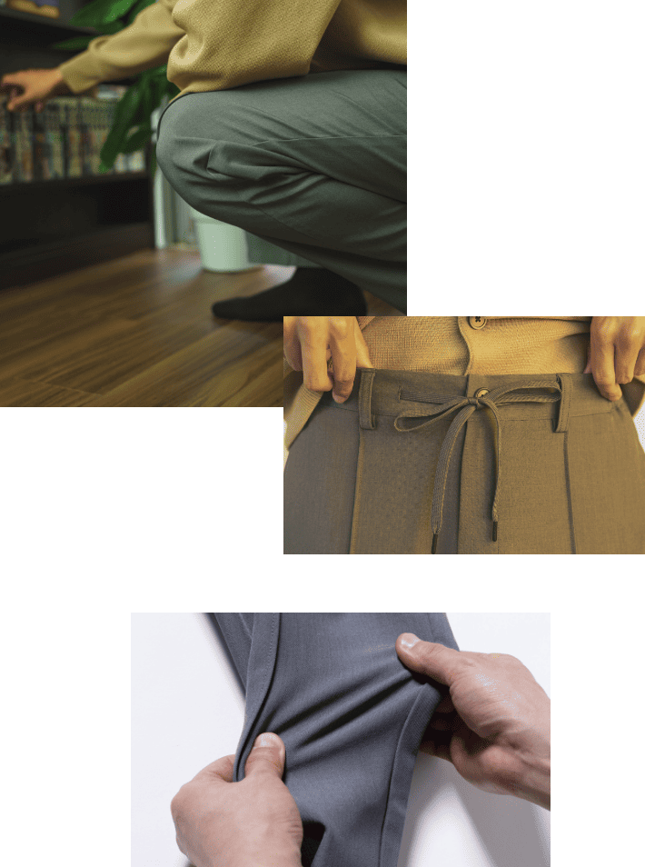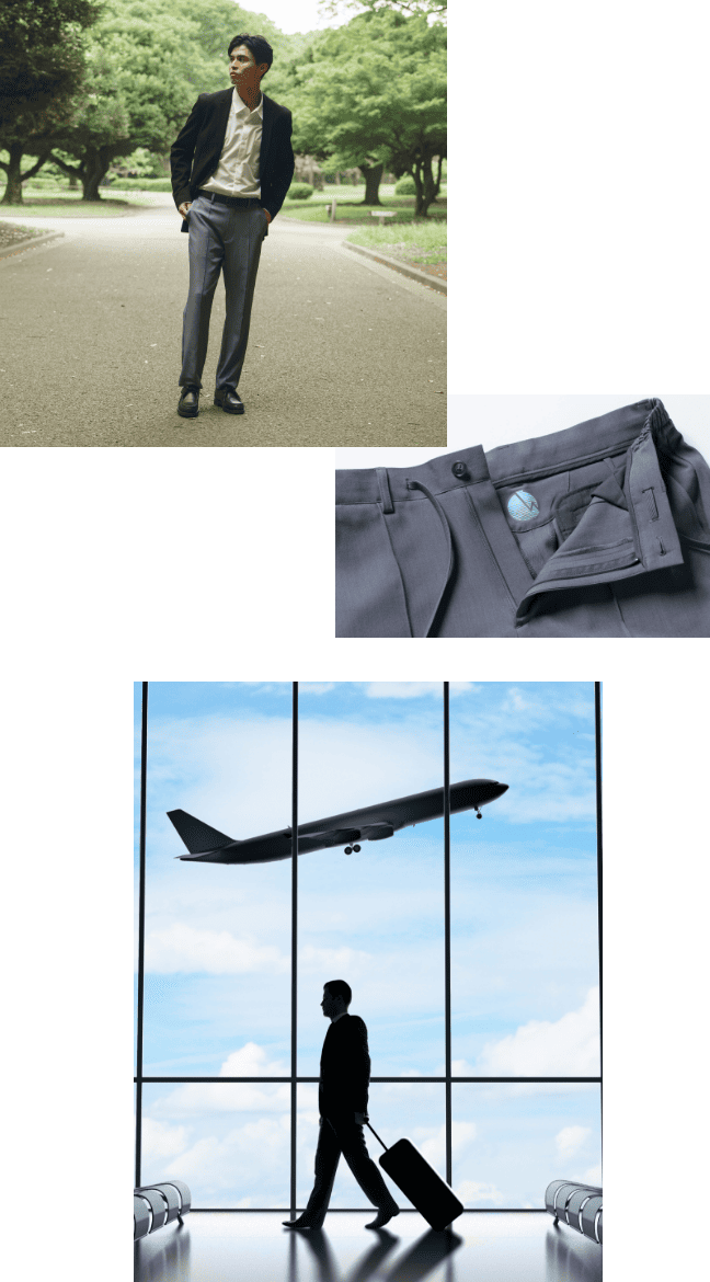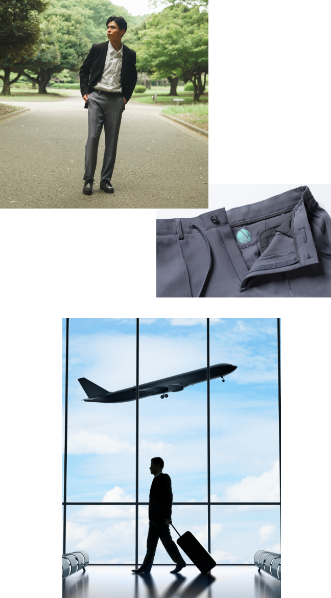 どんな移動も、もうストレスじゃない。座っても立っても、長時間のフライトでも常に快適。シワにならず、軽く、出張先でもすぐ乾く。パッキングから着用、現地での仕事まで一切崩れない。ONもOFFもこなすスマートな見た目に、旅慣れた機能性を備えた一本。