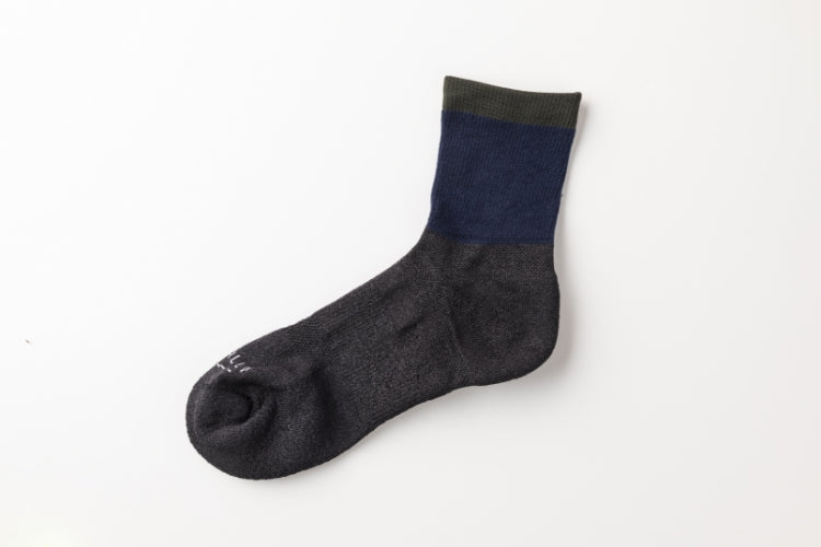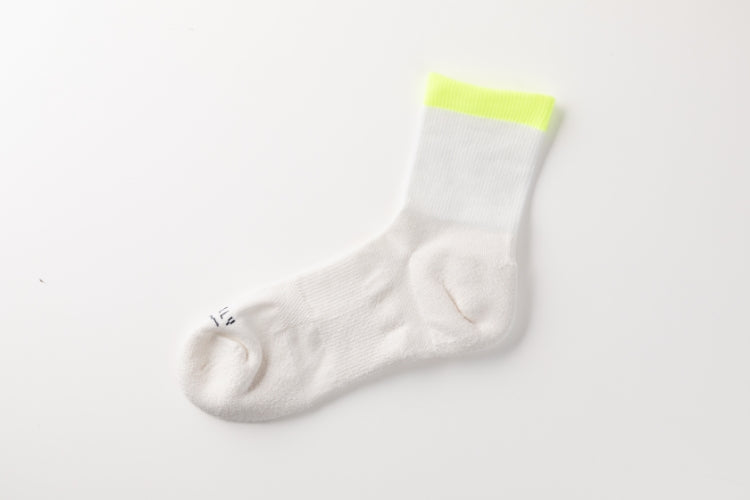 もっともムレやすい足裏だから、触れた時の心地よさを第一に考えパイル地に。裏面はサラシャリッとした肌触りの凹凸パイルで、履き心地はまるでタオルの上を歩いているかのよう♪ 履き口はオーガニックコットンの二重構造で、ゴム跡が付きにくい適度なフィット感です。裾から覗く蛍光イエロー、オリーブカラーは、スニーカーとの相性抜群です。2色セットで販売。